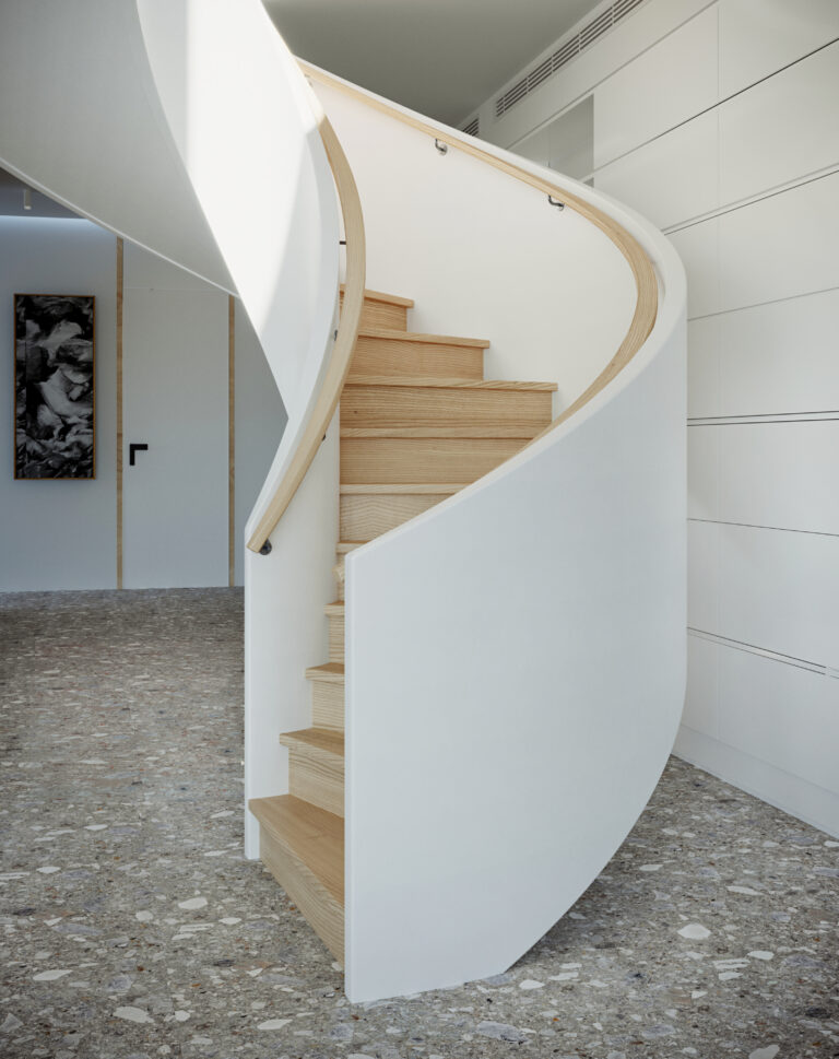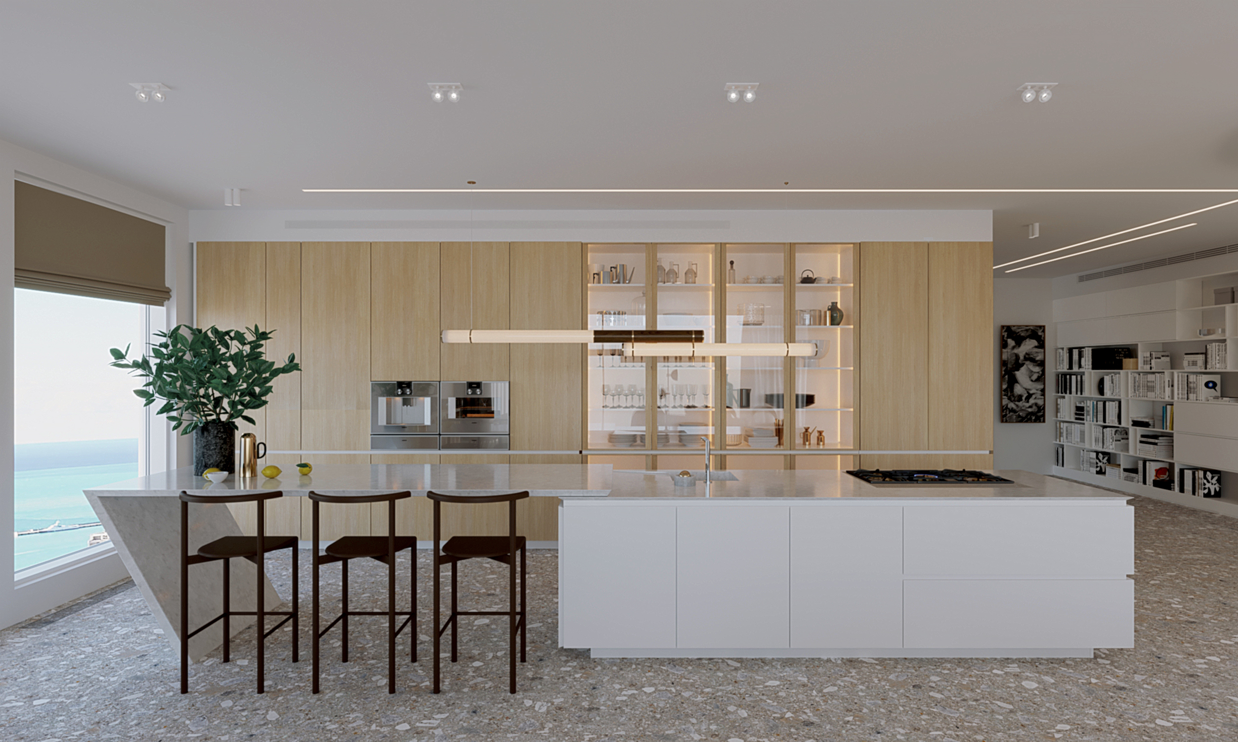 מאחר ולא מדובר בדירת מגורים רגילה, העיצוב תוכנן מלכתחילה כך שלכל אלמנט במרחב יהיה את התפקיד שלו ואת המקום שלו, וכלל אלמנטים דקורטיביים שנועדו להשרות אווירת רוגע ושלווה. היה לי חשוב לשלב את הרהיטים והפריטים שהביאו עימם הלקוחות מאירופה, שיחושו בבית בכל פעם שיכנסו אל החלל, גם אם הם נמצאים כאן רק בחלק מחודשי השנה. מאותה סיבה, שילבנו לכל אורך המסדרון ספריה עצומה שנבנתה בהתאמה אישית, שבה יוכלו להציג את אוסף הספרים האישי שהביאו עימם.